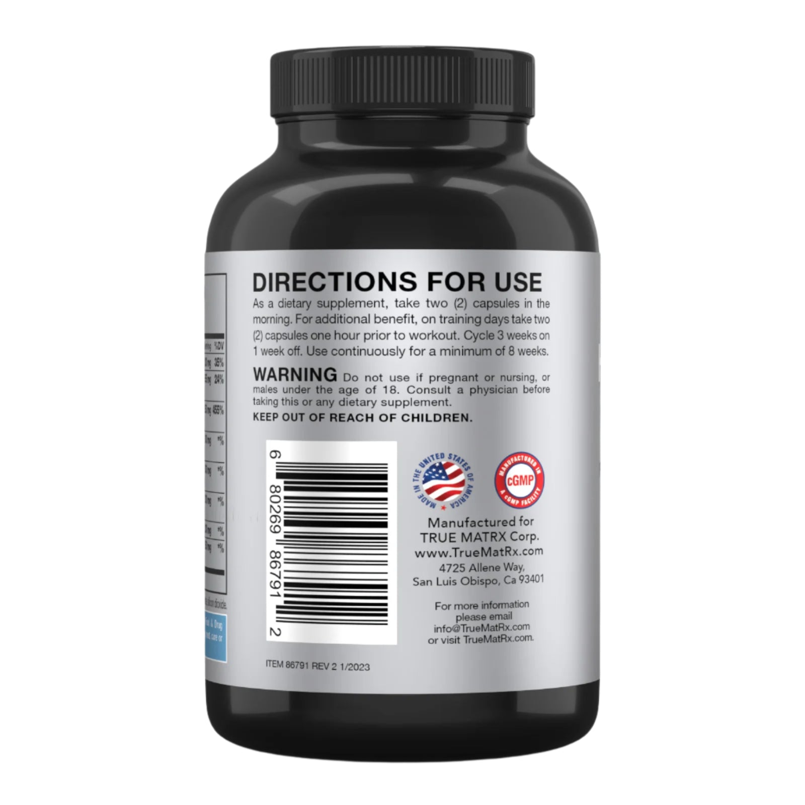 RECOMMENDED USE: As a dietary supplement, take two capsules (2) in the morning. For additional benefit, on training days take two (2) capsules one hour prior to the workout. Cycle 3 weeks on 1 week off. Use continuously for a minimum of 8 weeks.
