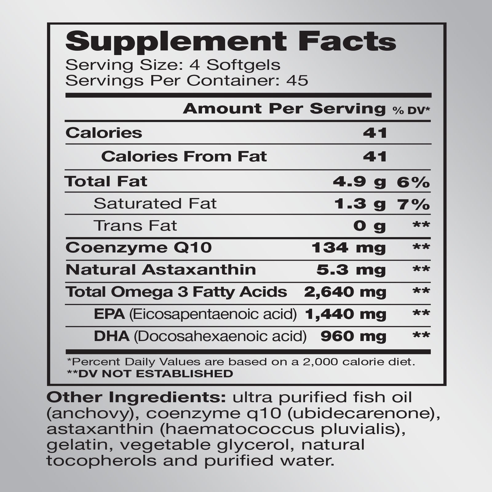 Our unique formula combines the powerful benefits of Omega-3 fatty acids with the antioxidant properties of CoQ10 and Astaxanthin to support heart and joint health, brain function, and overall vitality. CoQ10 is a vital enzyme that plays a key role in the production of energy within cells, and Astaxanthin is a powerful antioxidant that helps protect the body from free radical damage. Together, these nutrients work to support a healthy cardiovascular system, promote healthy skin, and improve overall energy levels.